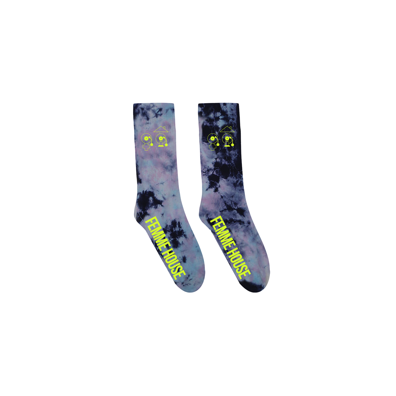 The Femme House Dyed Socks are 60% cotton, 20% nylon, 12% polyester, 8% spandex socks. Created with the logo for Femme House in neon green and a custom dyed pattern. If you play sports in the socks, you will likely be the biggest star on the court/field/arena. DRIP OR DROWN, FEMME HOUSE FAM!